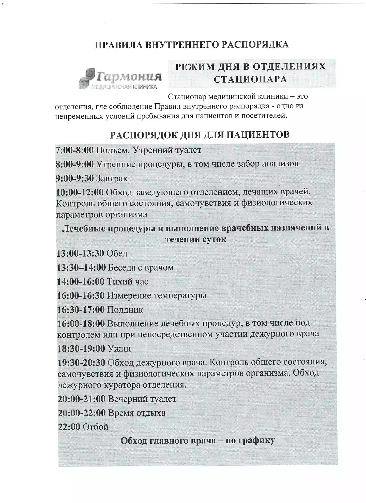 19:30-20:30 Обход дежурного врача. Контроль общего состояния, самочувствия и физиологических параметров организма. Обход дежурного куратора отделения.